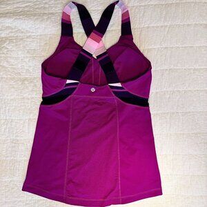 Lovely Lululemon raspberry pink color with gradient straps in purple, black, white and pink. Built-in bra and cross-back design. Size 8.