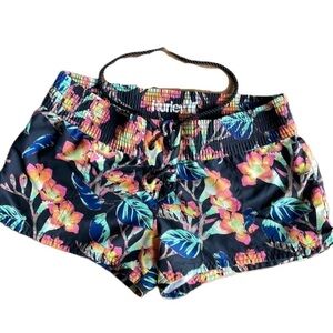 EC floral patterned board shorts with elasticized waist with additional tie. Velcro back pocket with key tab. Approximate measurements waist laying flat 16”, rise 9”, inseam 3”