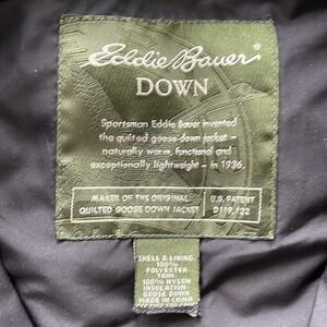 SzL Eddie Bauer Quilted Goose Down Black Vest, 2 zippered pockets, adjustable back waist snaps. Approximate measurements laying flat pit to pit 21.5”, length 24.5. Tiny snag upper back, shown in last photo,otherwise excellent condition.