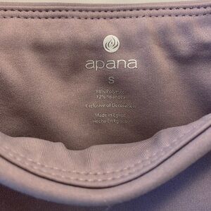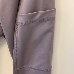 EC High Waisted Cropped mauve coloured leggings by Apana. Two side pockets with a thick feel to the fabric. Approximate measurements waist laying flat 12.5”, Rise 11”, Inseam 22”.