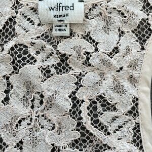 EC Wilfred XS lace Racerback see through tank. Peach/ cream colour. Approximate measurements laying flat pit to pit 17.5”, length from shoulder seam 28”. There is a stock photo to show the fit of the item. The listed item is featured in the remaining pictures and may differ in colour and pattern from the stock images