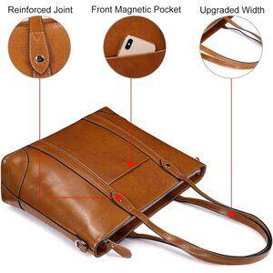 * Select Material:TOP POLISHED Cow Split Leather (Genuine Leather), polished with OIL WAX LEATHER, it would look a little shiny; SILVER Metal hardware, REINFORCED TRIANGLE stitching at handles for not breaking easily, special WIDER strap, lessen the pressure a common laptop bag can bring to your shoulders
