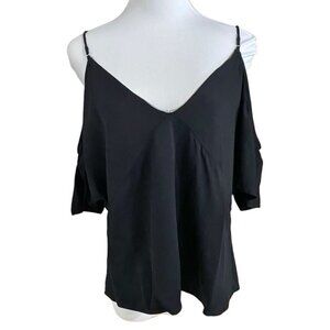 T ALEXANDER WANG BLACK METALLIC CHAIN V-NECK COLD SHOULDER TOP, Glistening silver chain trims the neckline of this slinky T by Alexander Wang top for a subtle edgy effect. Cut from buttery silk, its short slit sleeves drape elegantly off the shoulders with slender straps adding an extra femme touch. Adjustable spaghetti straps. lined - slightly cropped - v-neckline - boxy style - not stretch yet relaxed fit - chic yet fierce - perfect mix of a rock grunge and formal top for a night out / club - all seasons go to top.