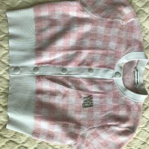 Short sleeve stretch cotton-blend terrycloth cardigan featuring check pattern in tones of pink and white. Rib knit crewneck collar, cuffs, and hem. Press-stud closure at front. Detachable crystal-cut logo brooch at chest. Cropped hem. White and silver-tone hardware.Supplier color: Cradle pink/White