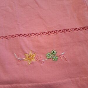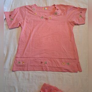 T C Fashion women's size Large lounge set, embroidered flowers, scalloped collar, picot trim on cuffs & bottom, bottoms have pockets, EUC