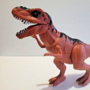 This T Rex toy is a no name brand of the classic Jurassic Park series dinosaurs. The toy is lightweight, has limited movement in both the jaw and legs, but does have a cool push button on the side that emits a roaring dino sound while lighting up the red eyes.