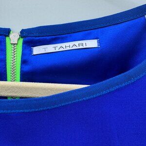 Make a statement in this stunning T Tahari sheath dress featuring a bold zebra-inspired print in blue, black, and white tones. The upper bodice is a rich royal blue, complemented by a neon green exposed back zipper that adds a modern twist. Perfect for both professional and social occasions. Fully lined for comfort and a flattering fit.