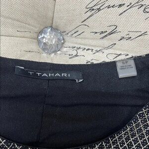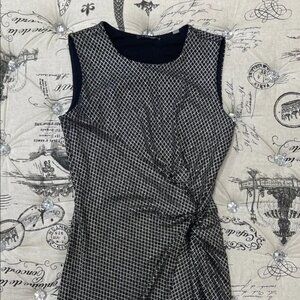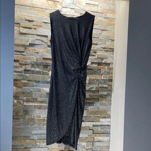 Chic black dress with asymmetrical hem. Features a twist detail for added style. Perfect for elegant occasions.