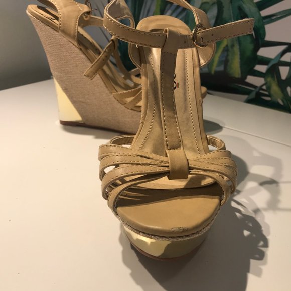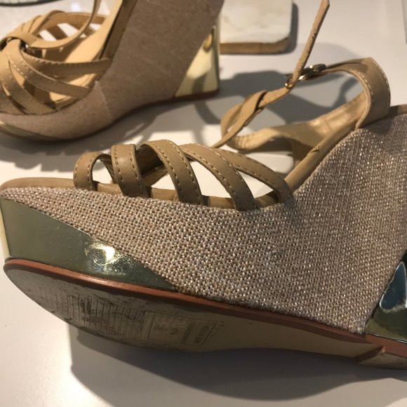 Stunning sandals with glossy gold accents on the front/back. Size 6 fits 7. Very light wear, beige leather look top and gold-flecked fabric sides. Shoe is light!