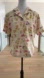 Tabi International vintage short sleeve button front notch collar camp shirt. Cream colour with a colourful gardening pattern overall. It includes dragonflies, garden clogs, baskets, gloves, flowers in pink, yellow and purple. There is a side slit on each side at the hem and on the hem of sleeves. 55% linen/ 45% rayon blend. Made in Korea.