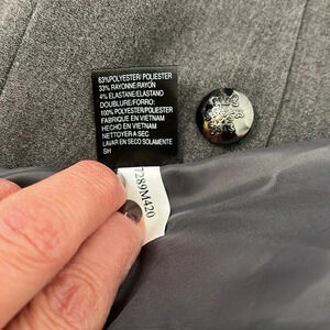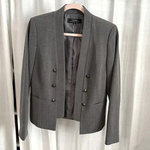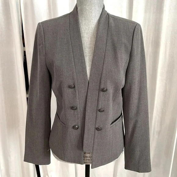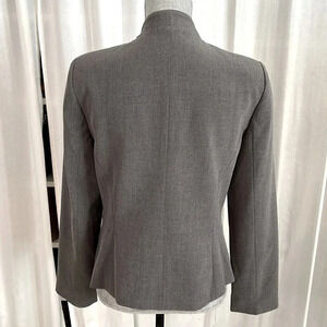 Fitted blazer open style with mandarin style collar. Front button details with pockets. Beautiful heavier rayon material. Perfect office look or wear it with jeans for an edgy look. Excellent condition like new.