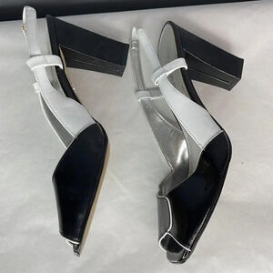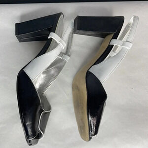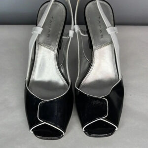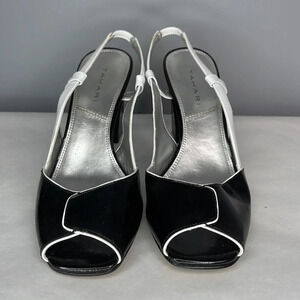 TAHARI Bevan Slingbacks Black White Block Heel Shoes Peep Toe Shiny Size 7.5
