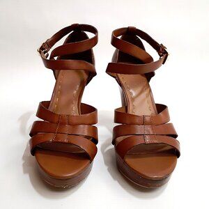 TAHARI Platform Heel Sandals with Cross Strap in Brown Tan Faux Leather