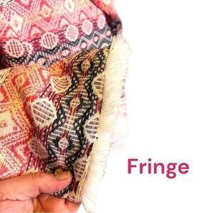 Very special Tahari open front blazer jacket. Multi-colours, a bohemian woven print, Hong Kong seams and Chanel-esqe fringe makes this a spectacular and well made jacket. Wear open or belted for totally different looks from formal to casual. Either way you’ll get noticed for all the right reasons.