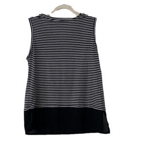 Get ready for summer with this Tahari sleeveless top. Features sleeveless design with black and white stripes, split sheer hem.