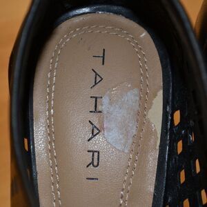 TAHARI stiletto high heels luxury perforated peep toe pumps black size 6