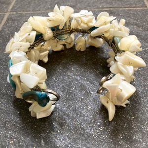 Pairs of freshwater pearls are strung along the chain of bracelet #1, alternating with chunks of mother of pearl, discs of abalone and faceted glass balls. Some of the warmest greens, blues, grays and shimmery shell cololurs of the sea are on display. The pearls and mother of pearl are accented with fancy but not flashy metal beads. Measures 6-1/2 inches, not including the secure bar in hoop closure. In great shape. I've added a cuff with chips of creamy shell and abalone individually wired to create something truly substantial. It's about 7 inches in length, with a 1 inch gap and somewhat expandable. Also in great shape.