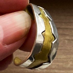 These curved post earrings, measuring 1-1/8 inches long and a half inch wide at the widest, were created by the American jewellers Jeep Collins.Founded a half century ago, Jeep Collins became known for beautiful, simple and solid pieces, often pairing brass and sterling silver, as in this case. Marked Brass, Ster and JC in a trademark symbol. In very good condition, with some tarnish on the brass inside the curves.