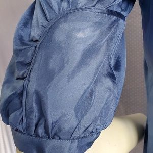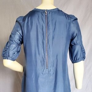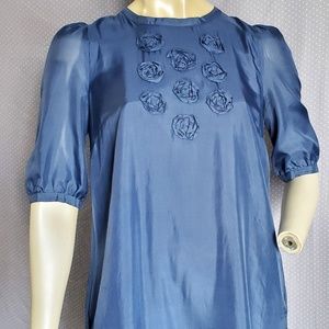 Appliqué roses on front decollate, ½ sleeves, paneling and slight rushing, elbow detail, horizontal pleated trim detail