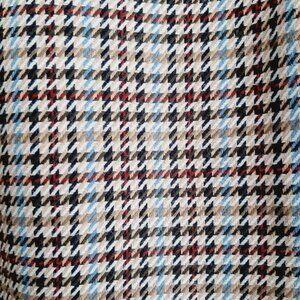 • Classic fit knee length pencil skirt in ivory white, cream, brown, black, red and blue hounds tooth pattern with eye/hook & concealed back zip closure. Fully lined.