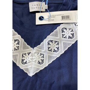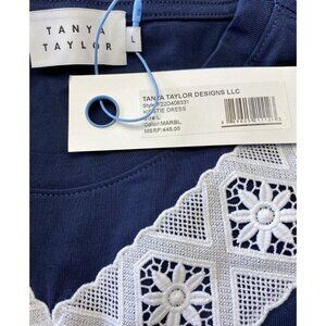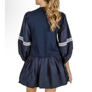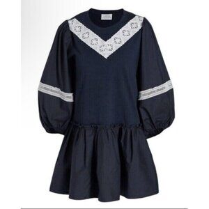 TANYA TAYLOR Sz L Dress Kirstie Puff-Sleeve Drop-Waist Mini Navy Blue White New