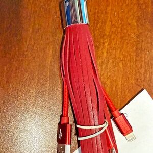 TASSLE, HAS 4 SHORT COMPUTER CABLES WITH DIFFERENT CONNECTION ENDS FOR CHARGING, LEATHER, GOLD, SILVER TONE METAL TOP AND SNAP, TAGS ON, NEW NEVER USED, NO DAMAGE