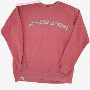 Get ready for a fashion statement with this Taylor Swift My Tears Ricochet Salmon Pullover Top Sweatshirt featuring a crew neck and long sleeves. The cotton blend knit fabric type ensures comfort and durability, while the graphic print and logo accents add a touch of style. This sweatshirt is perfect for travel, activewear, and casual occasions, making it a versatile addition to your wardrobe. It comes in size S and is part of the Taylor Swift product line, inspired by her music, band, and tour. 80% cotton 20% polyester.