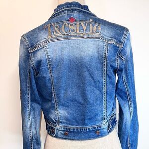 T&C Egyptian Stretch Denim Jean Jacket Crop T Logo Button Front Sz Womens XS