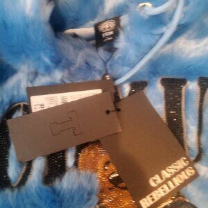 GORGEOUS FLEECE BLUE HOODIE BY TCH, RETIRED , SIZE LARGE , UNISEX. FULLY LINED WITH THICK SATIN BLUE MATERIAL . ZIPPER SLIT OPENINGS ON EACH SIDE AT BOTTOM . TWO SMALL POCKETS . DRAW STRING LARGE LINED HOOD. BEAUTIFUL SEQUENCED BEAR ON FRONT HAND DONE ,SLEEVE HAS SEQUENCED EMBLEM THAT SAYS "" LETS DO SOME DAMAGE "" IN BLACK AND SILVER .... LAST PICTURE NOT MINE BUT ADDED TO SHOW ON A HUMAN ...