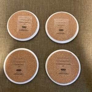 Pottery Barn ceramic 4” drink coasters TCM classic movie titles.