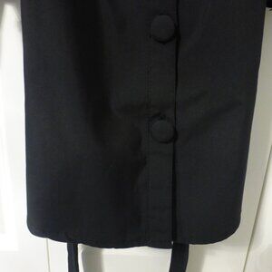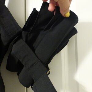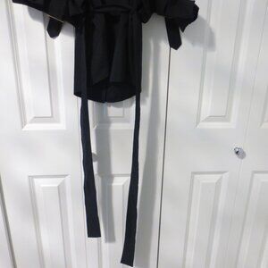 In very good condition! Adjustable straps, cuffed sleeves with removable and adjustable strap, the cuffs are sewn onto the top, the straps on each cuff can be removed, button up closure and removable waist tie/belt.