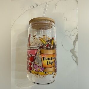 TEACHER LIFE 16 oz Glass Cup Coffee Tea Wine with Bamboo lid and Glass Straw NWT