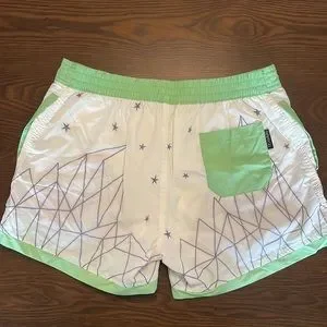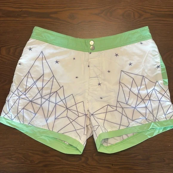 TEAMM8 lined swim trunks, two side pockets, one back. Twin snap and Velcro clasp on front. 4 inch inseam.