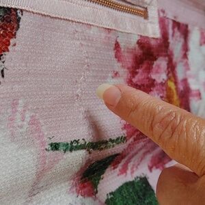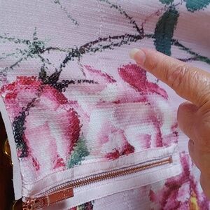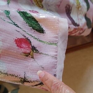 - pretty pale pink sequin top with beautiful floral print in dark punks, green, white and yellow