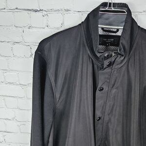 Ted Baker London Budpik full zip & snap button funnel neck bomber jacket. Some light sounds of wear. See photos for details. Otherwise great pre-owned condition.