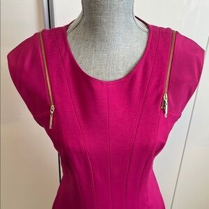 TED BAKER NWOT Pleated Zippered Cold Shoulder Fuschia Midi Dress Fit and Flare Gold Hardware, Size 8 (3 In Ted baker sizing)