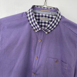 TED BAKER - Short sleeve, purple shirt with button-down checkered collar. Pocket on left side. Size 5 and fits like a slim UK L. Great fit and pop of colour!