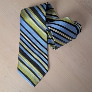 Elevate your style with this elegant striped tie. Featuring a blend of blue, green, and black, it's perfect for any formal occasion.