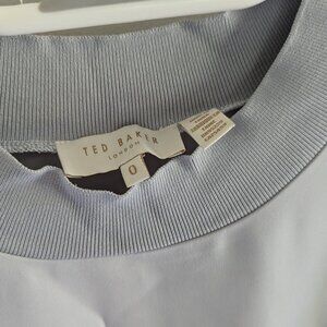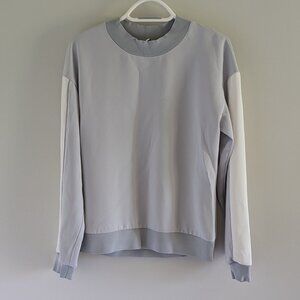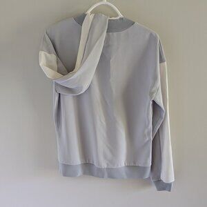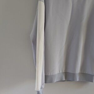 Light grey with blue hue and a white stripe down arm. Thin lightweight material. Stretchy band around neck, waist and wrists.