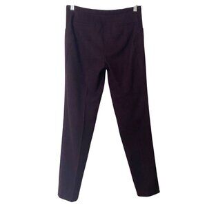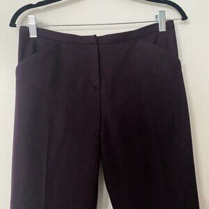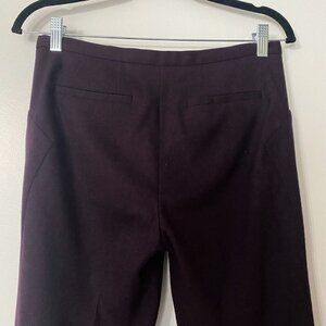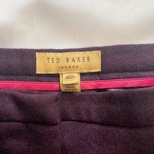 TED BAKER WOMEN'S UPALAT WOOL BLEND PLEATED SLIM FIT TROUSERS IN PURPLE, this is a thick wool felt fabric trousers in a pigmented dark purple - mid-rise - tapered slit fit leg - slash usable pockets - zipper fly with hook & eye closure- lined in a comfy satin lining - fall and winter favorite work / business / formal pants with a printed button down shirt and a coordinated blazer.