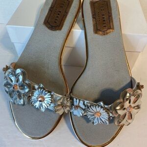 Beautiful pair of Keeley flat sandals by Ted Baker London. They offer a slightly cushioned foot bed for attic comfort. Silvery leather uppers with flower embellishments slip on style with an open toe. Synthetic sole. Gently worn, in excellent used condition.