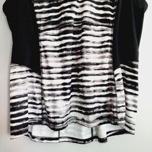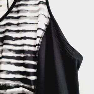 • Stretchy sleeveless v-neck top with black and white abstract stripe pattern. Perfect for restorative yoga, intense workouts, and everything in between.