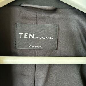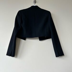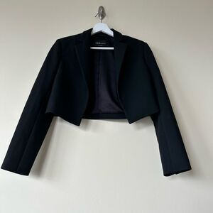 A gorgeous cropped, open-front blazer in colour black, with shoulder pads and a notched lapel.