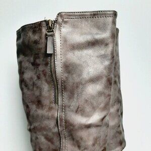 • High heel faux leather boots with inner zipper closure. Lightly ruched style with distressed finish. Taupe grey color.