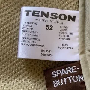 Excellent condition Men's jacket from Swedish brand TENSON Outdoor. Great workmanship and fabric quality. Fabric content is 65% polyamide - 25% cotton - 10% polyurethane. Beige colour.