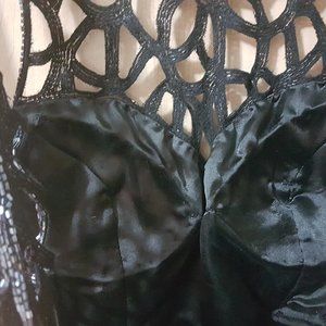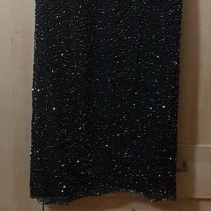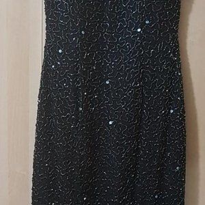 Completely embroidered with beads, paillettes and sequins. Taffeta lining. Built in bra. Color is Dark blue-grey.