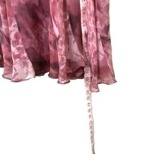 In excellent pre owned condition showing no signs of wear. Silk chiffon floral sheath ending in a softly flowing ruffled hemline. Attached tie at the neckline to tie or wear loose.