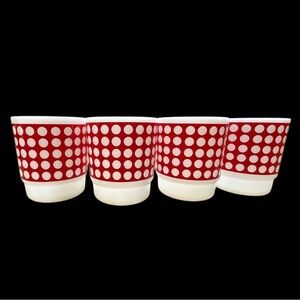 Set of 4 vintage Teromcrisa milk glass mugs. Red polka dot pattern with 8oz capacity. Each mug is in pristine condition with no chips, cracks or surface damage of any kind.
