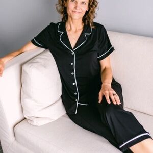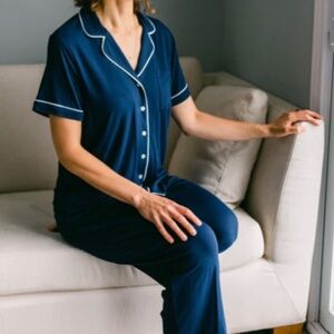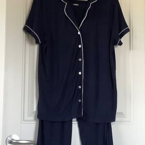 Soft, silky viscose ( from bamboo) set in dark navy. Size M. Pull on cropped pants with elastic waist. Button down top. You might want to stay n these all day!