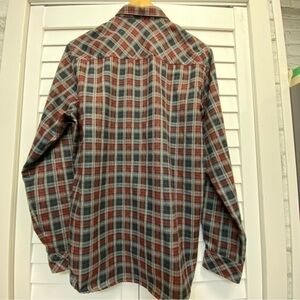 Long sleeve button down plaid shirt. Please see photos as there is an area on the inside collar that requires restitching (only on inside, does not go through to back). Tag says size Large. Please review measurements below to ensure a proper fit. Load flat measurements: Pit to pit: 23” Sleeve length: 26” Back length: 30”